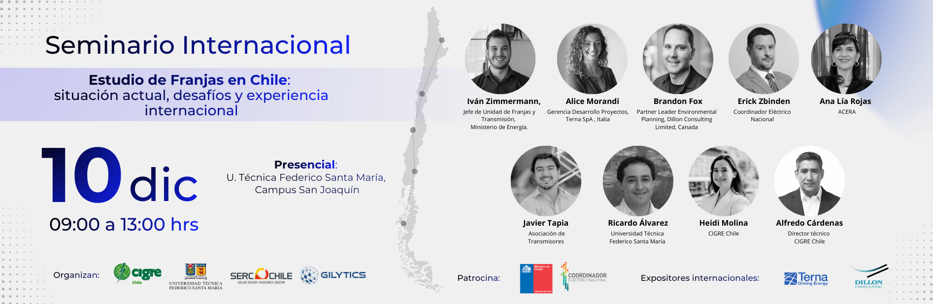 Esta iniciativa es organizada por académicos de la Universidad Técnica Federico Santa María, SERC-Chile y profesionales de CIGRE-Chile y Gilytics SA, es patrocinada por el Ministerio de Energía y el Coordinador Eléctrico Nacional y contará con la participación de expositores del Ministerio de Energía, el Coordinador Eléctrico Nacional, la empresa Terna SpA (Italia) y Dillon Consulting Limited (Canadá).