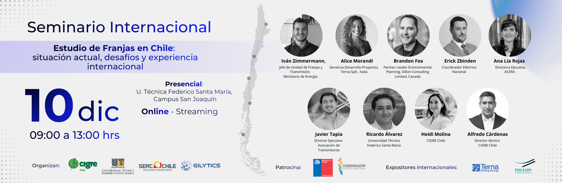 Esta iniciativa es organizada por académicos de la Universidad Técnica Federico Santa María, SERC-Chile y profesionales de CIGRE-Chile y Gilytics SA, es patrocinada por el Ministerio de Energía y el Coordinador Eléctrico Nacional y contará con la participación de expositores del Ministerio de Energía, el Coordinador Eléctrico Nacional, la empresa Terna SpA (Italia) y Dillon Consulting Limited (Canadá).